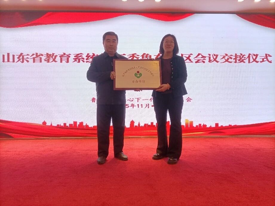 交接仪式上,鲁东片区牵头单位青岛市教育局关工委主任孙大贵从烟台大学离退休党委书记李荣梅手中,接过2025年“会议承办单位”标志牌。