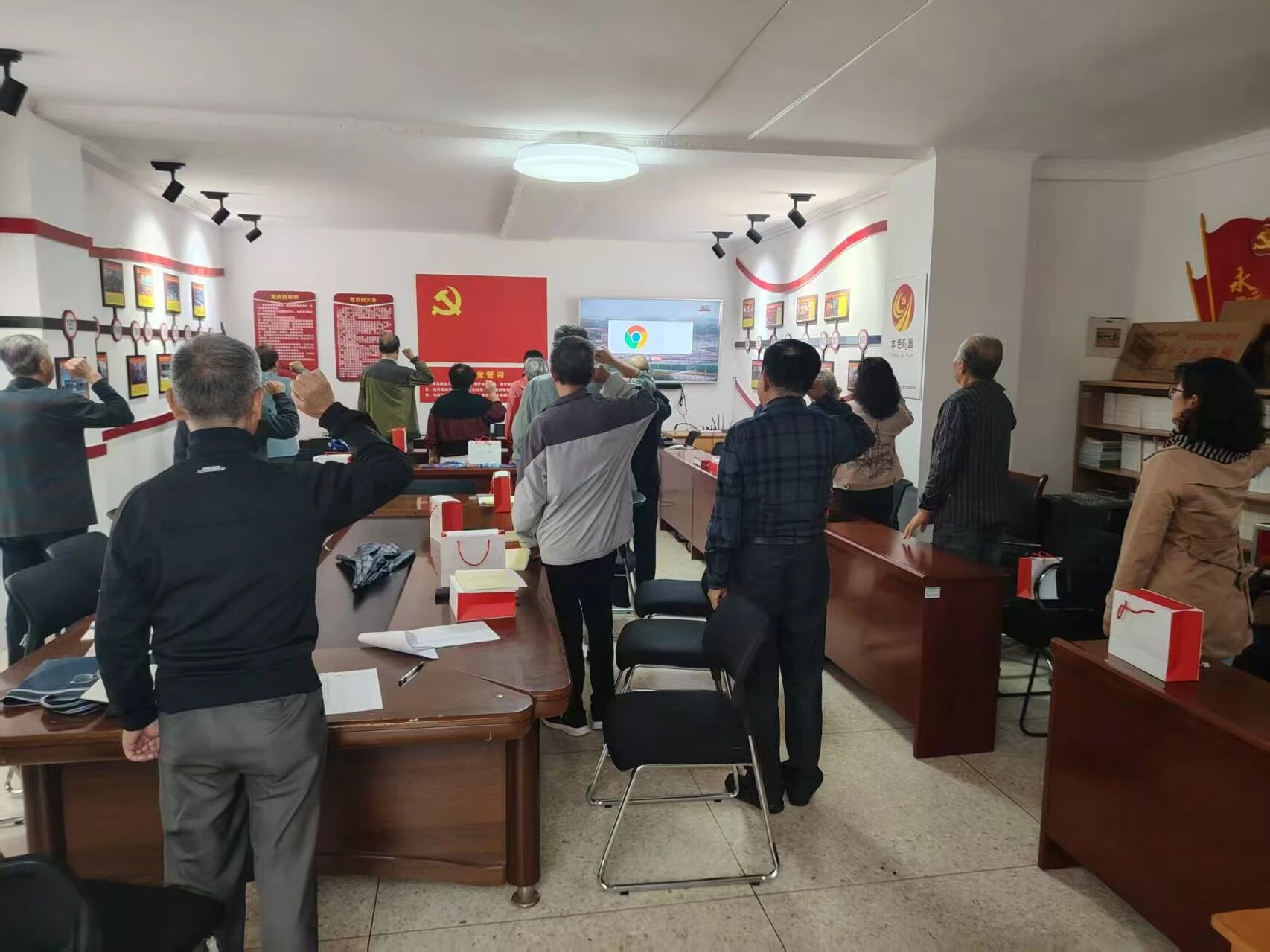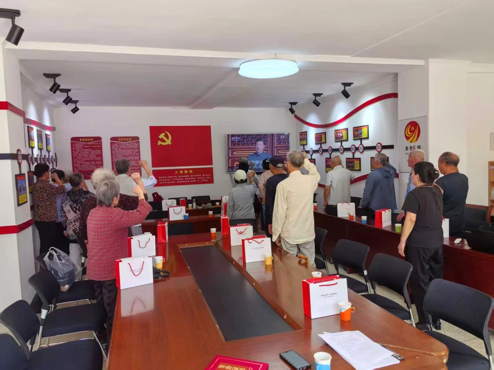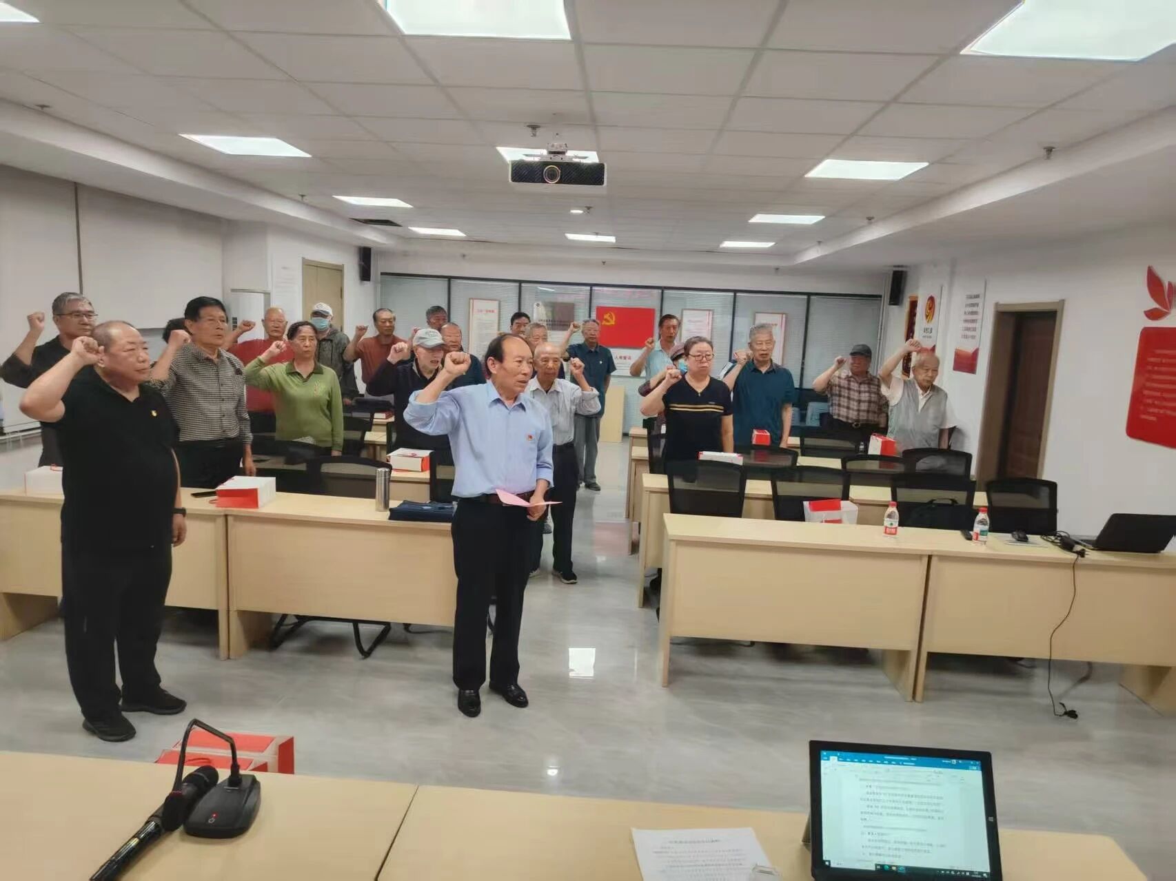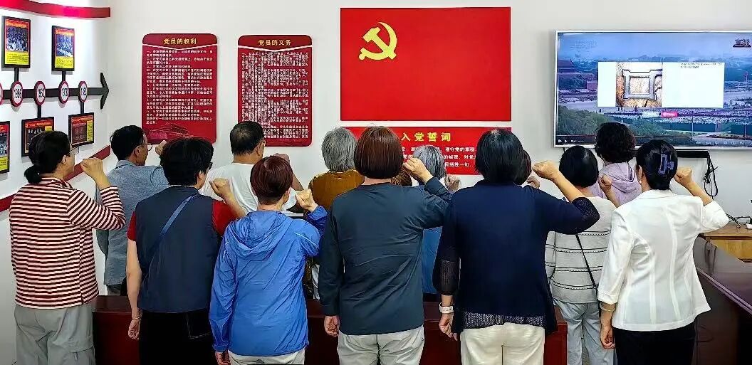 活动最后,老党员面向党旗,举起右手,重温入党誓词。